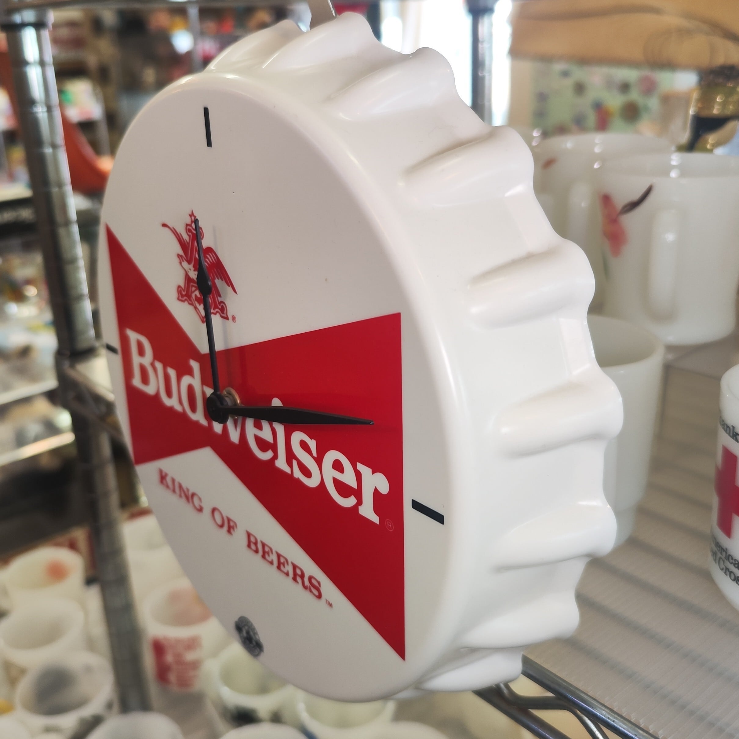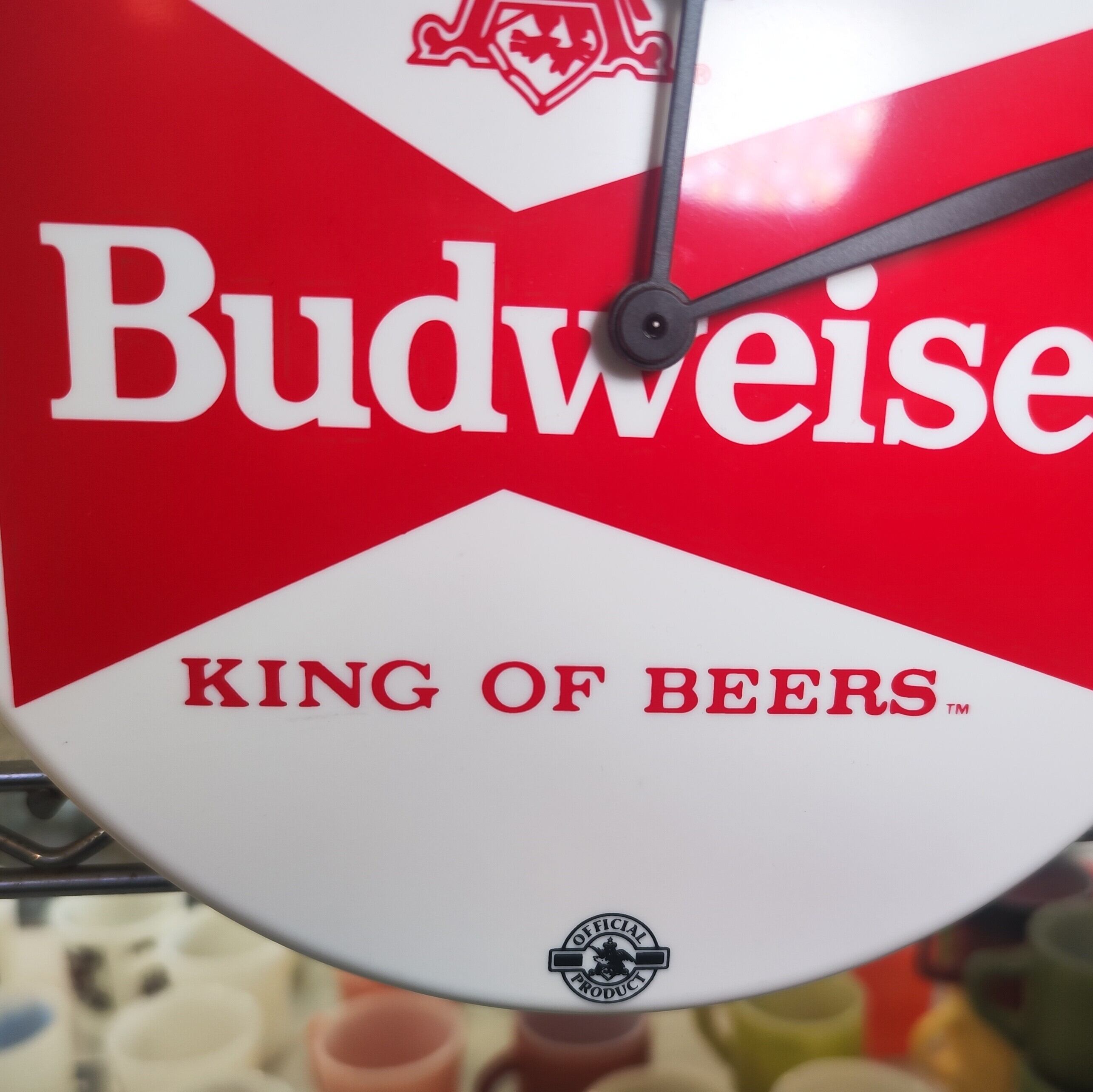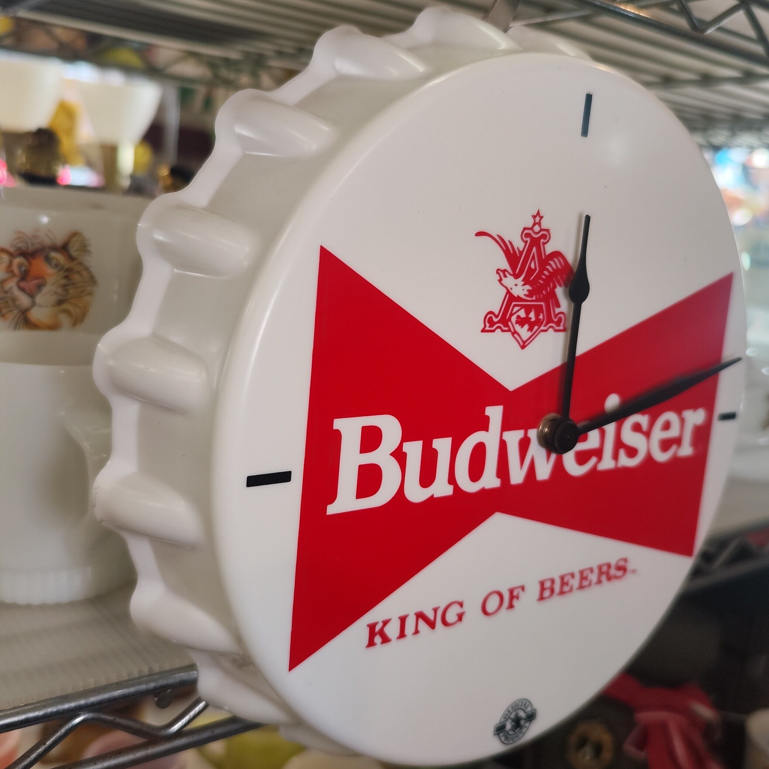 バドワイザー(Budweiser)のボトルキャップ型壁掛け時計です。中央にはバドワイザーの象徴的な「ボウタイロゴ」と、スローガンである「KING OF BEERS」が描かれています。