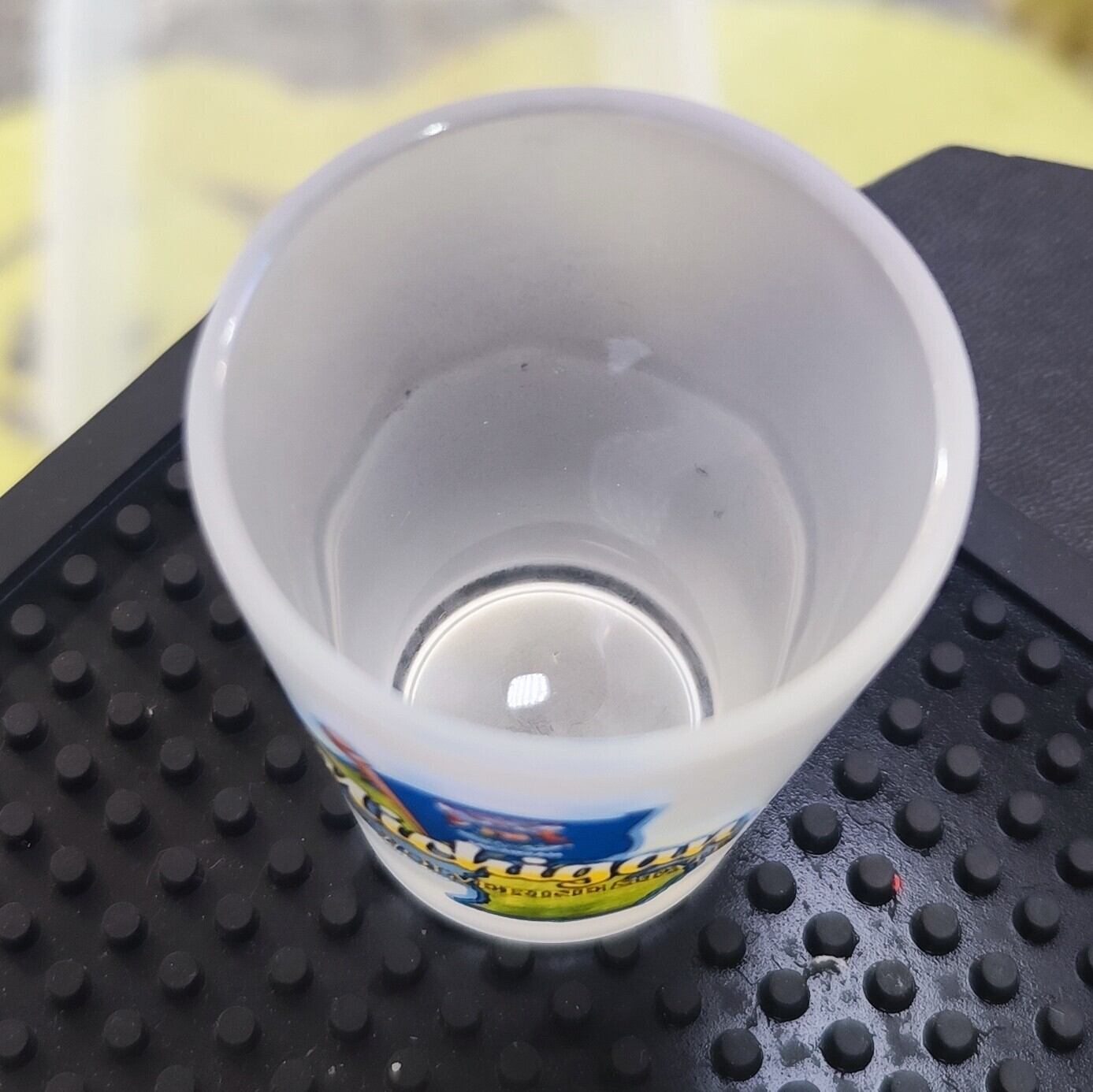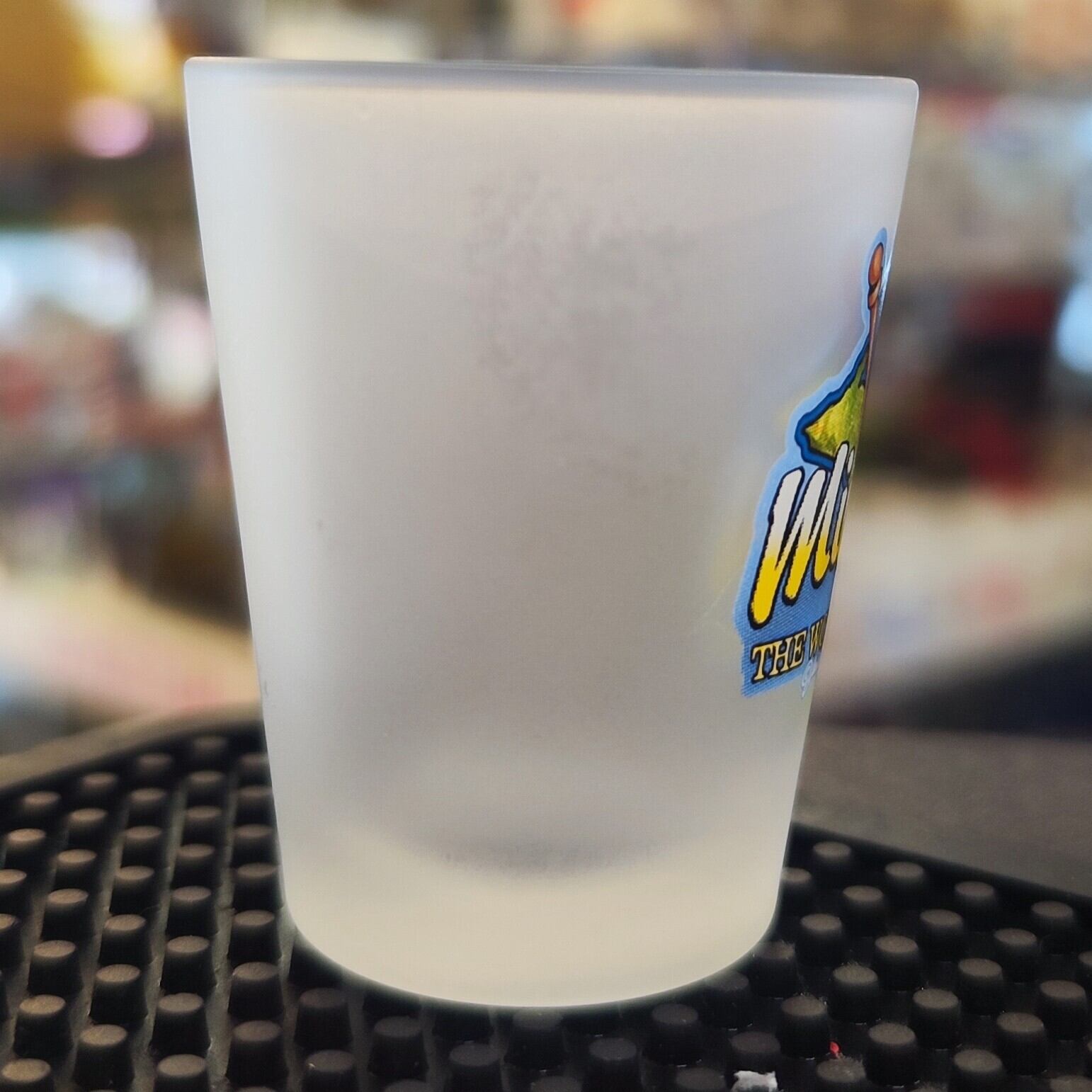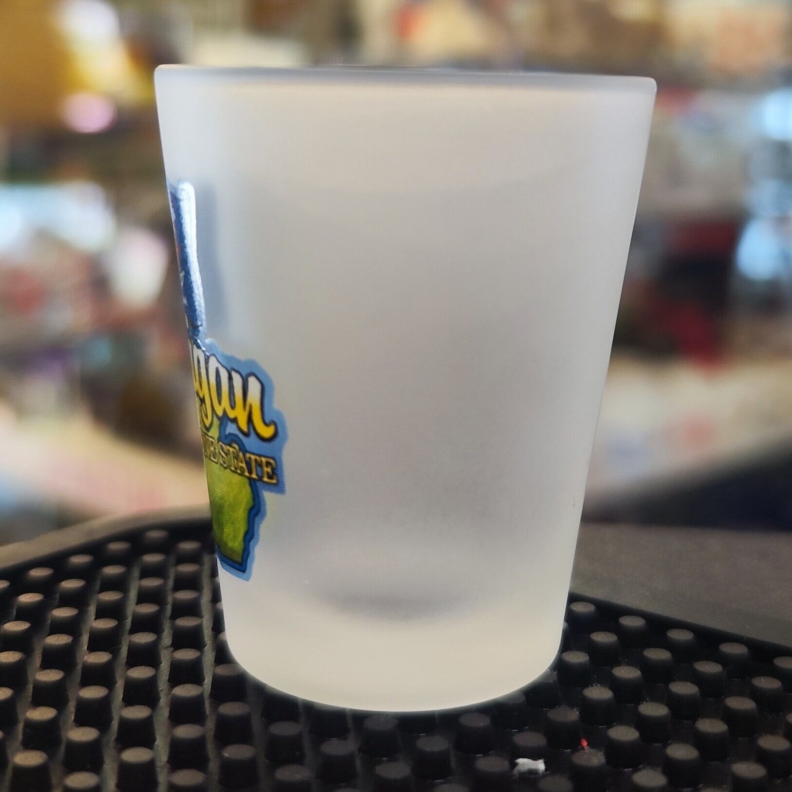 アメリカ、ミシガン州のショットグラスです。ミシガン州の地図、州旗、州の愛称である「The Wolverine State」の文字が描かれたカラフルなデザインです。