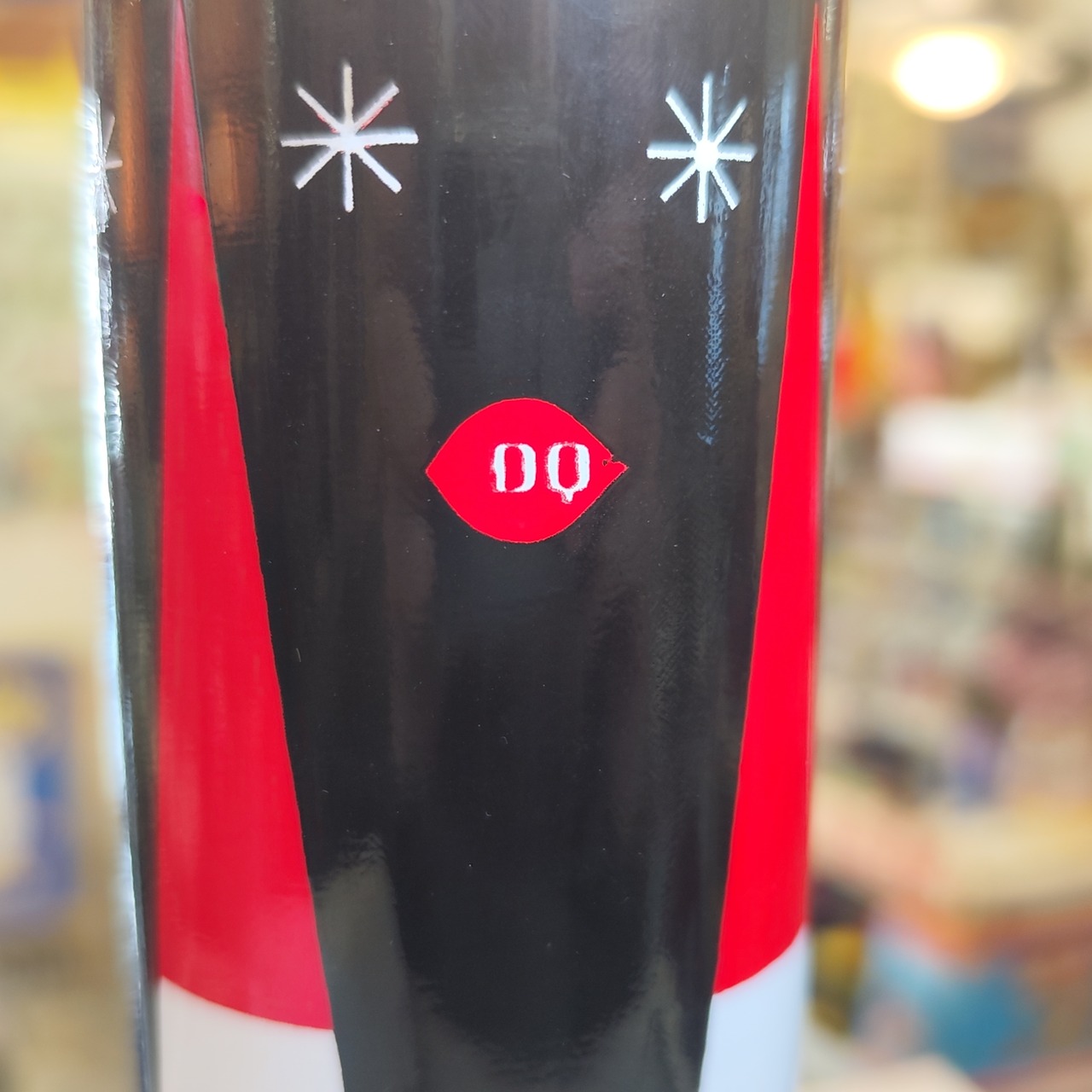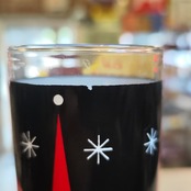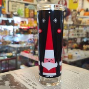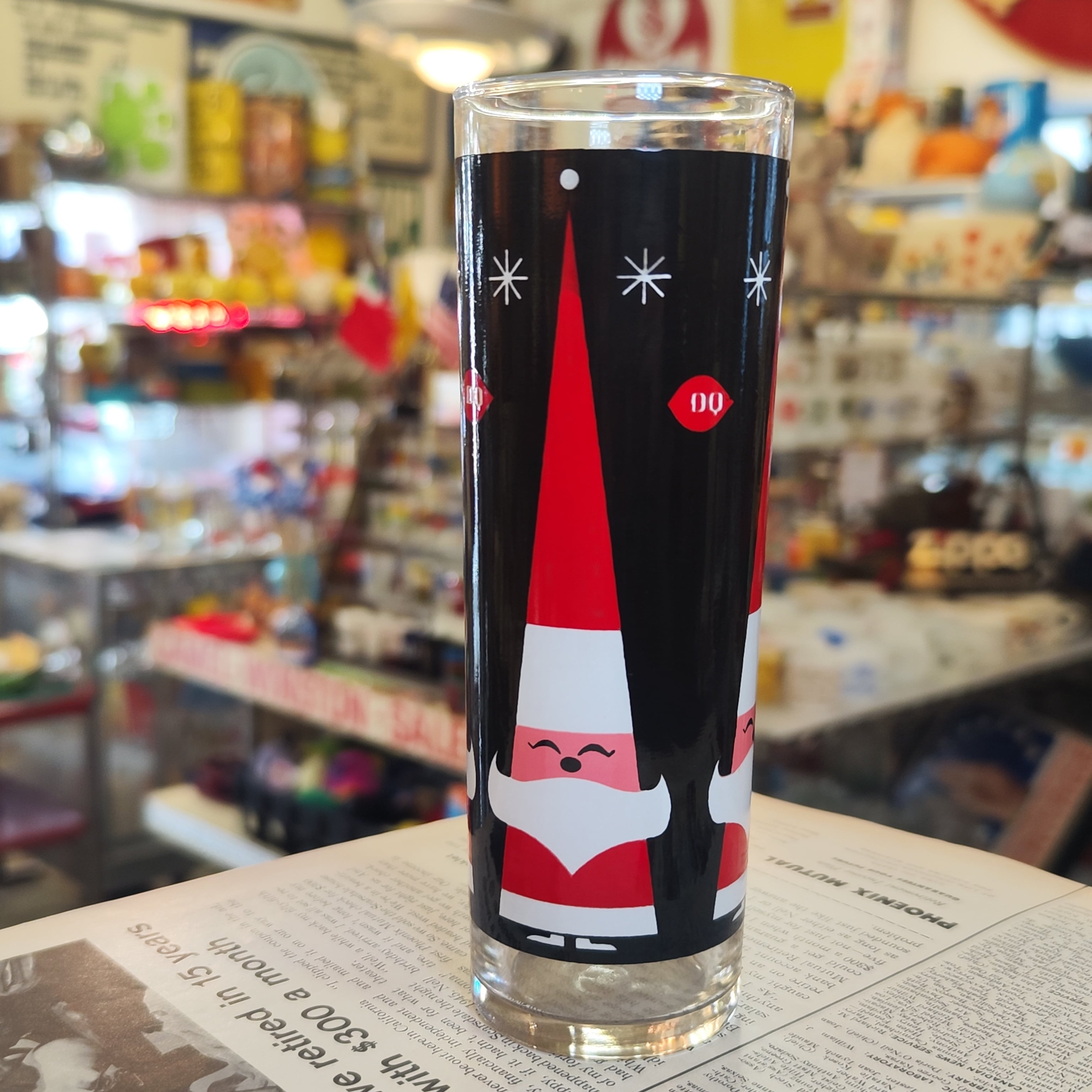 Dairy Queenのプロモーション用に制作されたHolt Howardのデザインによるハイボールグラスです。 黒い背景に、背の高い赤い帽子をかぶったサンタクロースが描かれており、白い「アトミック・スターバースト(星の輝き)」のパターンが特徴です。